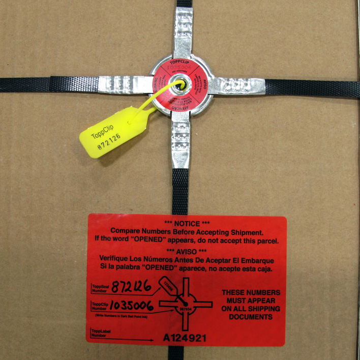 In addition to eliminating the generic metal crimps, it also adds protection to the strapping. ToppClip™ is the only crimp needed to secure the banding. If there are other banding crimps, it would be an indication that something has been tampered with. When the ToppClip™ is applied, it is virtually impossible to tamper with or replace the banding without leaving visible marks. Serial numbers of seals should be recorded on shipping documents by the shipper. In addition to verifying the serial numbers, the receiver should look for other signs of obvious tampering.
